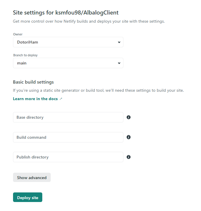 - Publish directory: 빌드가 완료된 후 빌드 파일이 생성된 폴더 이름 ex) dist or build