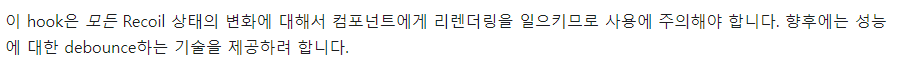 이렇게 사용하기 쉽고 여러 기능들이 hooks로 제공해주고 있어서 recoil을 사용하기로 했지만, 다소 아쉬운 부분들이 많았다.