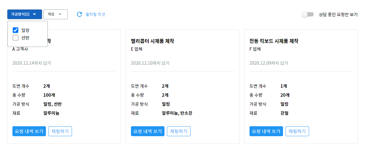 또한 상담 중의 옵션도 가공방식 + 재료 메뉴와 같이 필터링이 적용된다.