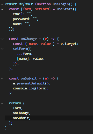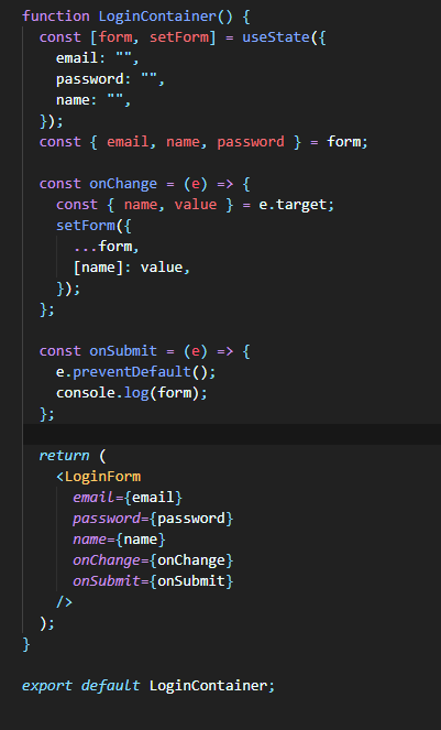 custom hooks 패턴은 기존 presentation, container 패턴에서 로직을 hooks로 관리하는걸 말한다. 기존 container에서는 공통 로직이 발생했을 때 다른 container 컴포넌트로 로직을 넘겨주지 못했는데, hooks로 로직을 관리하게 되면, UI 재사용을 넘어서 로직까지 재사용이 가능해진다. 위에서 작성한 Login 로직을 hooks로 분리하면 아래와 같다.