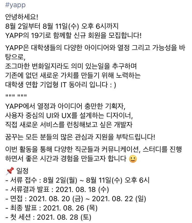 Yapp 동아리에 대해서 소개하는 글을 보면 다음과 같다.