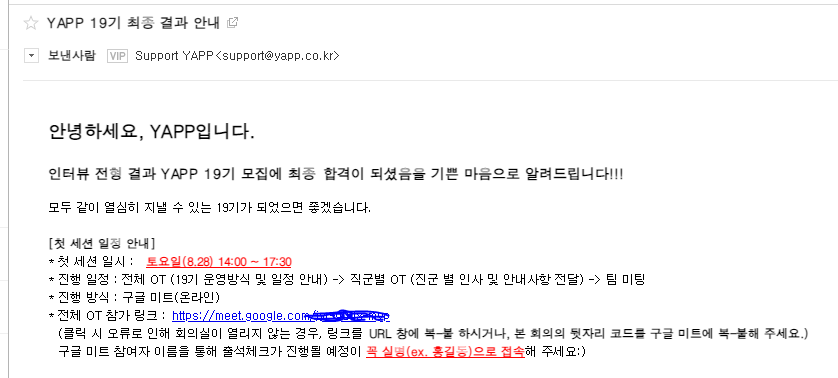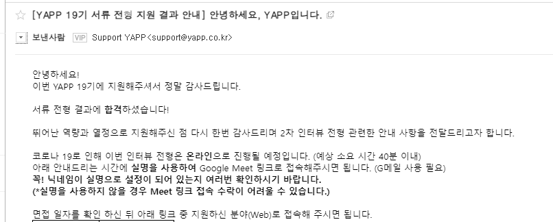 서류 결과 발표일 8월 18일 오후 2시쯤에 yapp에서 메일이 왔다.