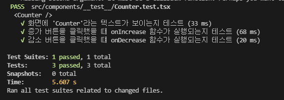 Counter.test.tsx 파일에 아래와 같이 적어주고 터미널에 yarn test or npm run test를 입력해보자.
